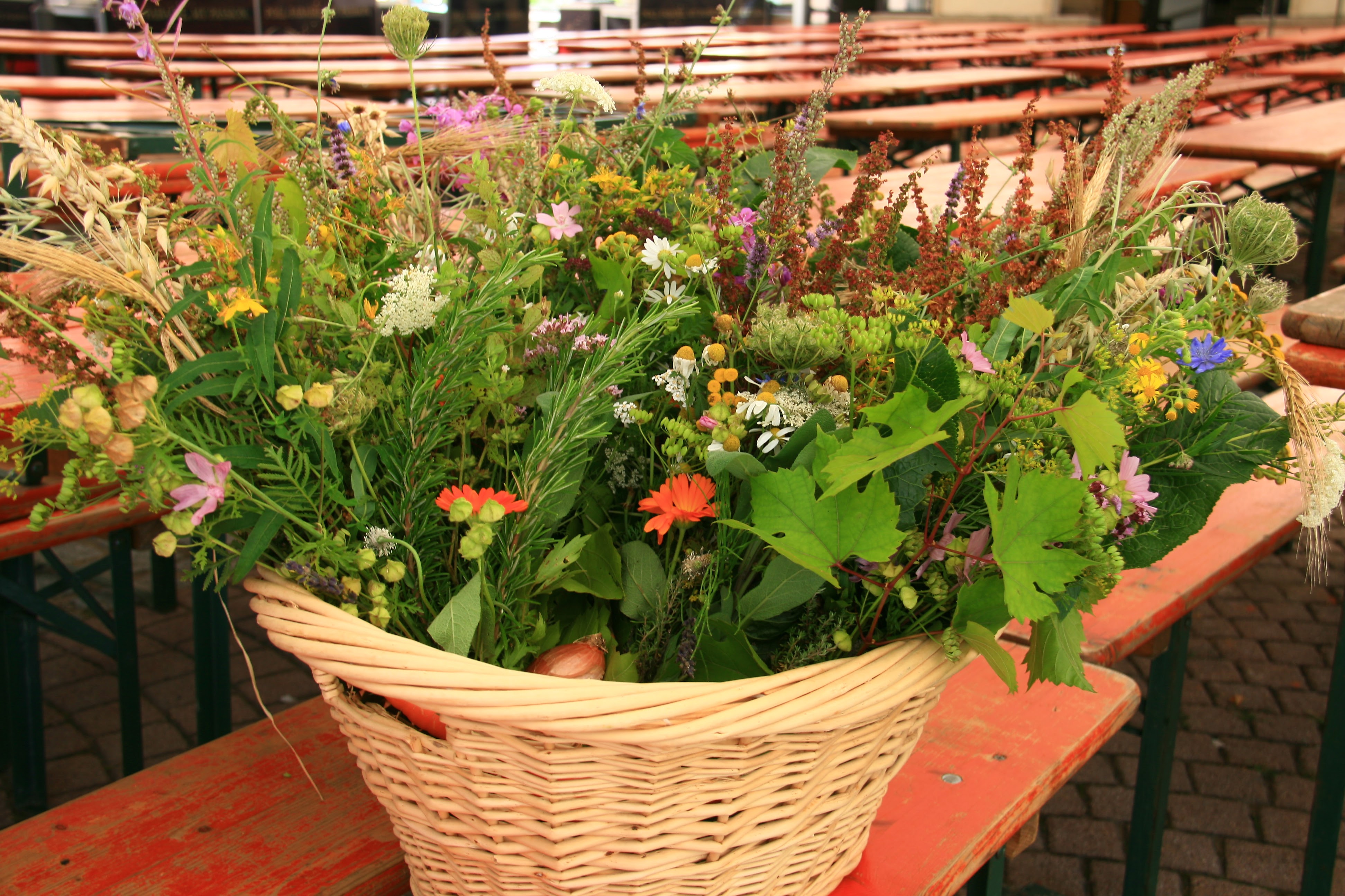 In den Kräuterstrauß gehören wildwachsende Kräuter sowie Gartenkräuter und verschiedene Getreidesorten. Eine Möhre und eine Zwiebel vervollständigen das Gebinde.